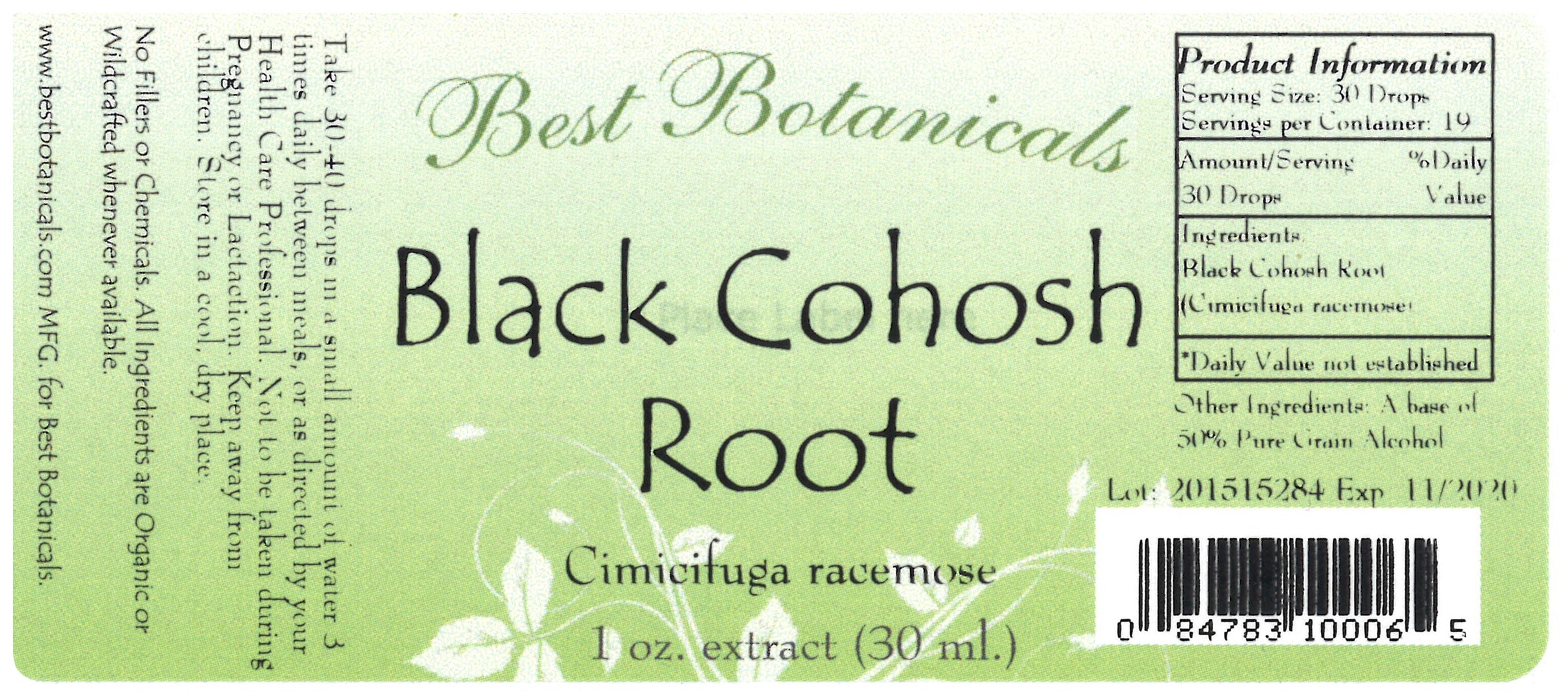 Black Cohosh Root Extract 1 oz. 50% pure grain alcohol base.